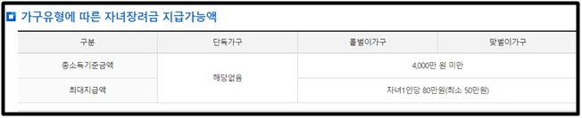 ◆ 가구 유형에 따른 자녀장려금 지급가능액(표 참조)