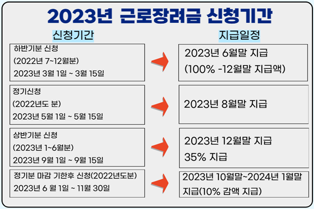 ▶ 2023년 근로장려금 지급일과 같을 시, 상반기, 하반기, 정기 신청 이후 3개월이 지나면 지급