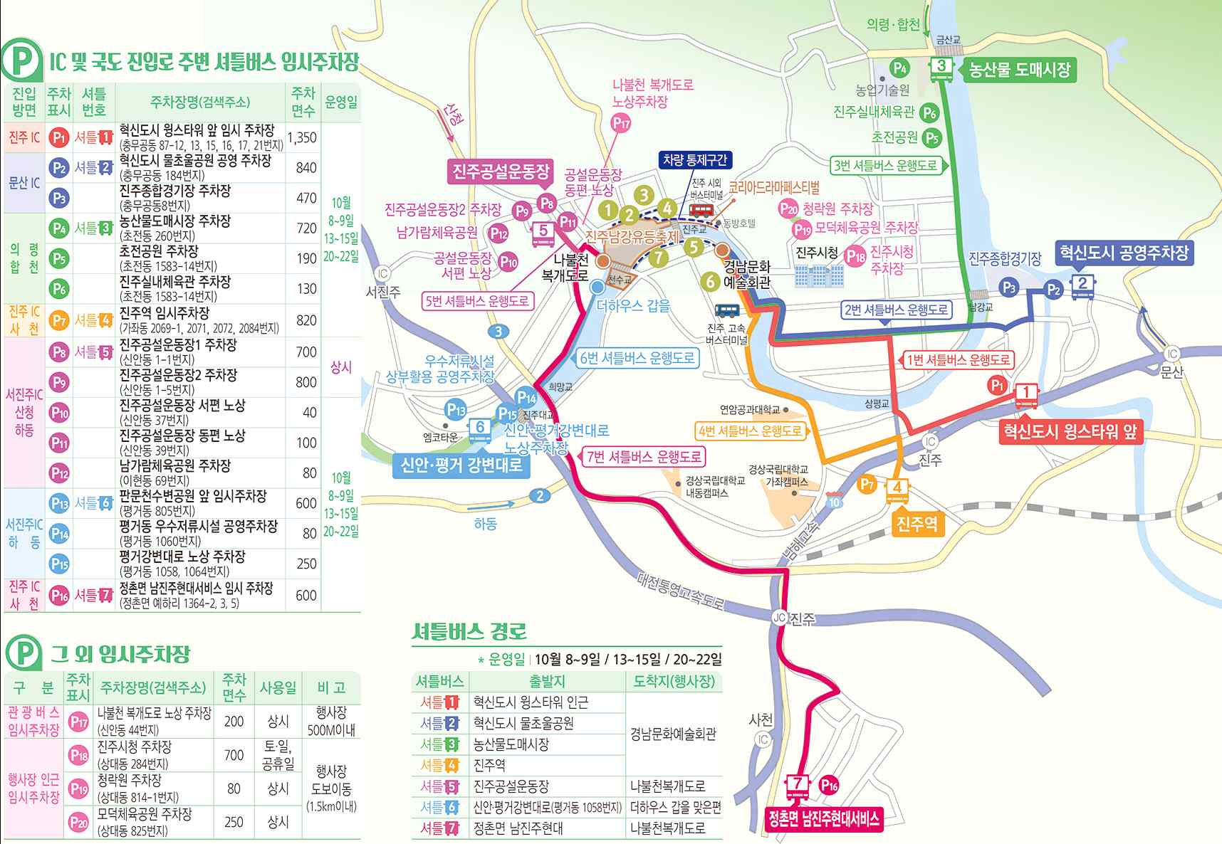 - 축제 기간에는 주차가 매우 힘들어, 행사장과 조금 떨어진 농산물 도매시장, 혁신 도시 공영 주차장 등 조금 먼 곳에 주차하고, 무료 셔틀버스나 시내버스 이용을 추천