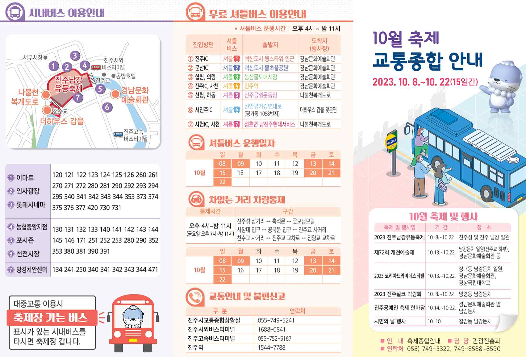 - 10월 8일부터 22일까지 '역사의 강 평화를 담다'라는 주제로, 다른 해와 똑같은 장소인 촉석루 앞 남강에서 진주남강유등축제 개최