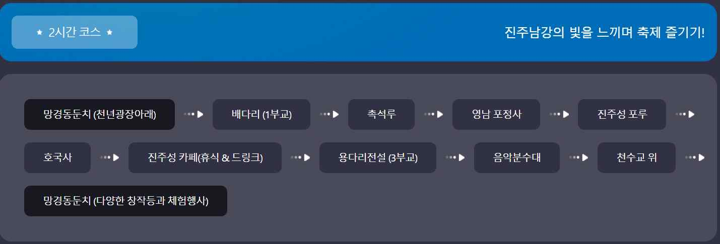 - 진주남강유등축제 홈페이지에 소요 시간별 추천코스를 안내, 1코스는 진주성 쪽 풍경 위주, 남강 변을 거닐 수 있는 2시간 코스와 3시간 코스를 추천