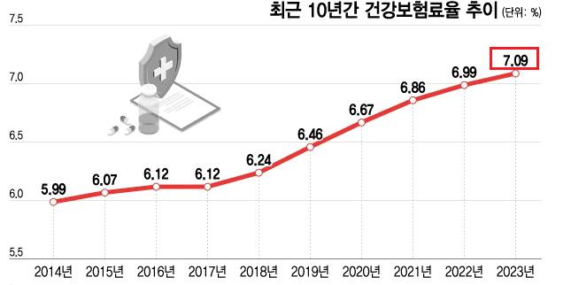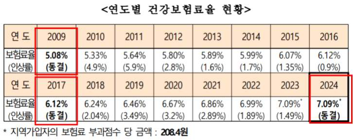 2) 2009년에 5.08%였던 건강보험료율이, 2023년 7.09%로 약 2.01% 포인트 상승(동결은 2009년, 2017년 2회, 2024년 동결 예정)