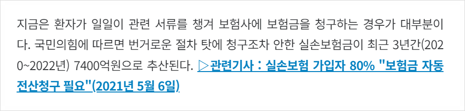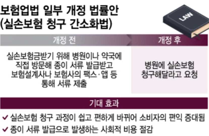 * 실비보험이라 불리는 의료 실손보험의 신청 간소화가 14년 만에 국회 본회의 통과
