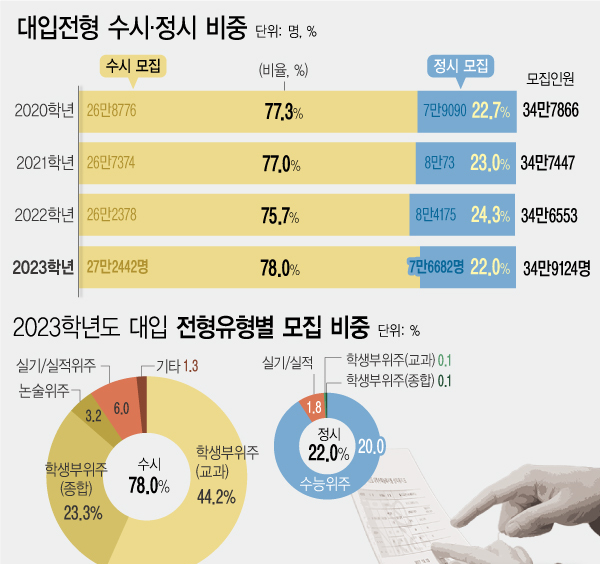 6) 정시 비중이 점점 높아지고 있고, 재수 비중도 점점 높아지고 있음(내 등급 하락 가능성은 언제든 존재)