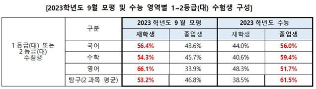 2) 수능에서는, 역으로 N수생이 1~2등급 과반 차지