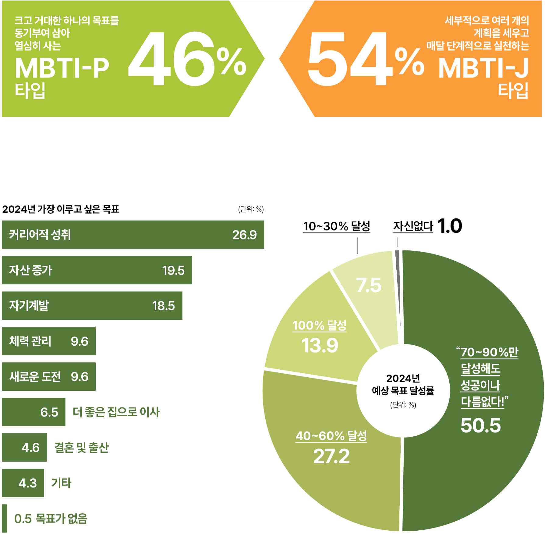 ▲취업 또는 이직, 승진 등 커리어적 성취 26.9%, ▲저축 및 투자를 통한 자산 증가 19.5%, ▲새로운 취미 탐구, ▲공부 등 자기 계발 18.5%, ▲다이어트, 운동 등 체력 관리 9.6%, ▲사이드 프로젝트, 대학원 진학 등 새로운 도전 9.6%, ▲내 집 마련 또는 더 좋은 집으로 이사 6.5%, ▲결혼, 출산 등 새로운 가족 만들기 4.6%, ▲목표가 없음 0.5%, ▲기타 3%